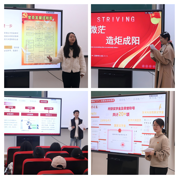 国家奖学金获得者银瑞同志以“不啻微茫,造炬成阳”为主题,分享了个人在学业、竞赛、志愿服务等方面的成长经历。她多次获得一等奖学金,积极参与数学建模、市场调查等多项国家级、省级竞赛并屡获佳绩,累计志愿服务时长百余小时,展现了新时代大学生勤学笃行、甘于奉献的优秀风貌,为发展对象树立了勤学奋进的标杆。