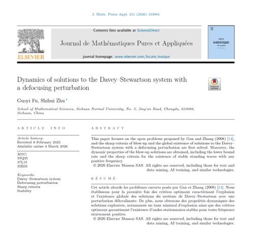 近日,数学科学学院朱世辉教授与其指导的研究生付国毅在国际著名期刊《Journal de Mathématiques Pures et Appliquées》上发表题为“Dynamics of Solutions to the Davey-Stewartson System with a Defocusing Perturbation”的研究论文。